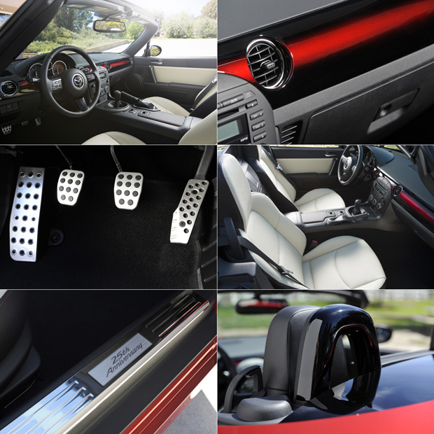 內裝包括手工烤漆的暗紅色飾板、金屬踏板組、「Light Stone」白色皮革座椅、25th Anniversary字樣門檻踏板、與後方的防滾架護蓋等等,都是MX-5 25th Anniversary Edition特有的配件。
