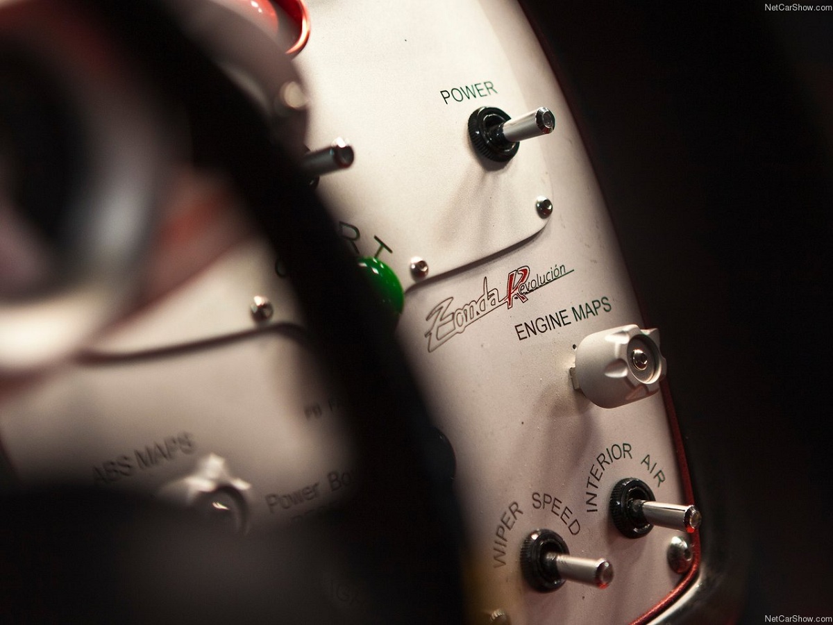 而Brembo所提供剛性更強的F1等級陶瓷碳纖維煞車系統(CCMR)比之前款式(CCM)減重了15%,並且更著重於低溫的工作效能,這並使得碟盤的耐用度大幅提升了四倍,而加上全車碳纖維的外殼,車重僅有1070kg。而光靠輕量化想要在起伏路面多的紐柏林賽道拿到優異成績是不夠的!因此Zonda Revolucion最特別的地方在於可依車手的駕駛習慣,進行12種個別設定的ABS系統,並且在後尾翼部分安裝了可變風阻系統DRS(Drag ReductionSystem),這項利器共可在時速100 km/h以及側向加速+/- 0.8g以上時,提供兩種不同尾翼角度的設定,並且可透過方向盤上的按鍵切換自動或手動。有了這幾項神兵利器,不難想像可以獲得如此驚人的單圈成績。