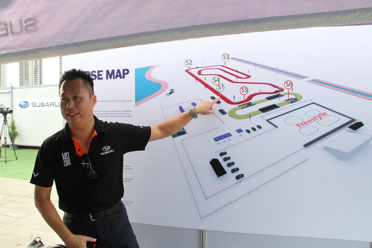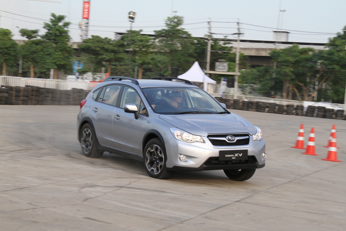 原廠安排了三項關卡來進行試駕,首站安排了以錐筒圍繞出的模擬賽道,可進行直線加速然後煞停、九十度大彎、迴轉、繞錐以及麋鹿閃避模擬的測試。並且現場也安排了舊款XV來進行比較,直線加速與煞停基本上新舊款均無任何差異,加速表現在四千轉以前都有稍輕微的貼背感,但僅算是平順的加速表現。而重力煞停時,四輪都能很平均的展現制動效能,不會有重度點頭危及行駛動態的情形發生。