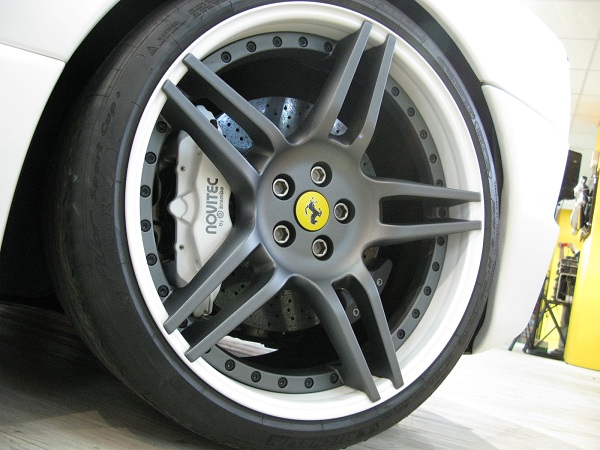 全車碳纖維套件,包括前包導流板、前下導流板、側裙、後下導流板、後窗導流板、引擎蓋導流板、車頂碳纖維、引擎室內全碳纖維套件、後尾翼、後視鏡,所有的碳纖維件都是乾式碳纖,所有的車身導流板都是經過風洞空氣流量測試開發自然加強了原廠Ferrari下壓力不足之處!輪圈選擇Novitec Rosso NF3鍛造雙片式輪圈,輪胎採用PIRELLI P-zero前255/30 ZR 21,後335/25 ZR 22,避震的部分Novitec Rosso跟KW配合開發運動版的短彈簧,可以降低35mm,再搭配油壓式的升降套件可以有40mm的升降幅度,適合日常開車使用!此特別版Novitec Rosso為全球第一輛597 Italia完整車,非常具有獨特性與完整性!