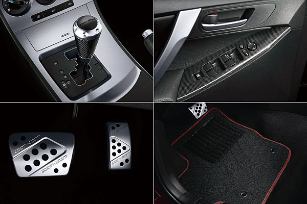Mazda3「型動版」前門兩側換上跑車專屬類碳纖維內裝飾版、以賽車鋁合金及正碳纖維管材打造的Zoom-Zoom排檔頭、Zoom-Zoom賽車式踏板與紅色滾邊的型動版專屬腳踏墊等。
