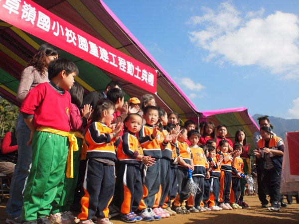 三年前由於辛樂克颱風造成校門口邊坡崩落,後來再遇八八風災侵害,山崩落石更加危及校園安全,全校師生因此撤出舊校舍的草嶺國小,在這段沒有校舍的日子裡,都是借用草嶺地區旅社的空間作為臨時教室繼續課業教學,而在校長及各地人士的奔走下,草嶺國小終於覓得新的校地和興建資金進行動土施工,預計再一年的時間新校舍即可落成。「Zoom-Zoom HUG」活動團隊去年來到此地,見到了全校師生們在克難的環境下展現出的強韌與樂天,時隔一年應邀重返舊地,可以看到新校舍終於動土,想到學生們很快就有嶄新的校舍可以使用,與會成員們心中的感動難以言喻。