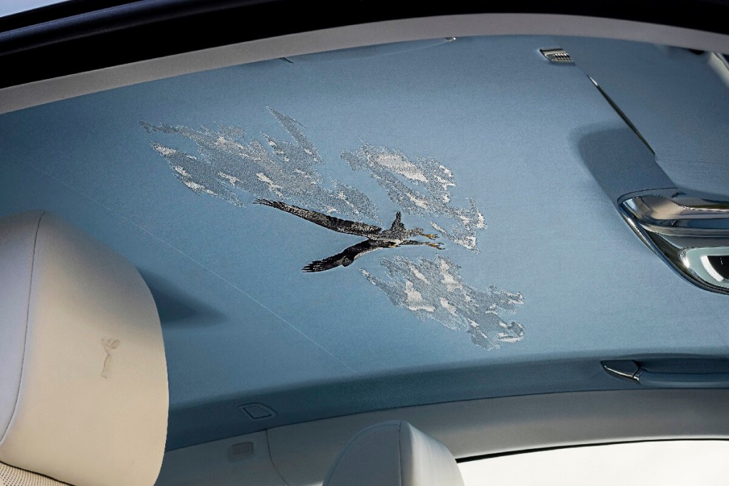 由Rolls-Royce定制設計團隊設計的猛禽,在Wraith車內頂棚襯裡中,以逼真的複雜細節進行了體現。其由近25萬針組成的華麗刺繡花費了一個月的時間,由一組設計師、手工技師和工程師所共同開發。