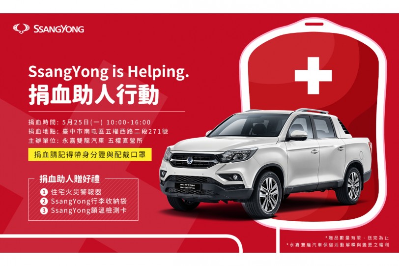 SsangYong總代理永嘉雙龍汽車長期致力於社會公益活動,過去在罕見疾病基金會、民間司法改革基金會、財團法人老五老基金會、浪浪的後盾協會、信望愛智能發展中心、社團法人台灣基地協會、財團法人人本教育文教基金會、社團法人台灣畫話協會內都曾見過SsangYong雙龍汽車默默行善的助人足跡。在國內疫情初期,SsangYong雙龍汽車也率先提供車主品牌口罩與領先業界提供醫護人員購車優惠,只要國內有需求,雙龍汽車總是願意挺身而出,這次因應血荒期間,雙龍汽車也期待能鼓勵民眾一起把關懷化作實際行動,共同挺台灣、挺醫護、助人利己捐熱血。