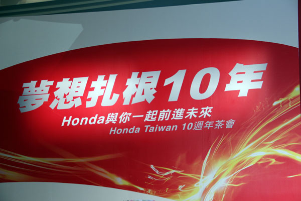 在慶祝酒會中,Honda Taiwan董事長金山裕則表示:「這十年,是Honda Taiwan奠定在台灣永續的基礎。2002年,秉持企業「購買的喜悅、銷售的喜悅、創造的喜悅」的三種喜悅,Honda Taiwan以“顧客滿意度第一”及“成為被期待存在的企業”兩大目標,與全國經銷商攜手齊心,邁出嶄新的腳步。同時今年我們預計導入兩款大幅進化的重要商品,以此兩車款為主,我們訂定全年25,000台,全期30,000台的銷售目標。」