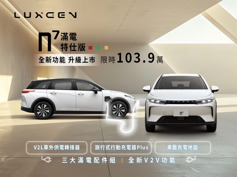 新世代純電休旅 n⁷以「純粹亮點」為核心設計語彙,外型延續 LUXGEN「以風塑形」的理念,不僅車身線條簡約時尚,搭配後驅配置、加速度隨呼隨至的純電動力系統,帶給您純電世代獨享的嶄新駕馭體驗,是國內同價格帶唯一具備純電動力之中大型 SUV,擁有2,920mm 軸距的寬敞車室空間,搭載智慧駕駛輔助 ADAS Lv.2+、OTA 雲端更新、快充隨插即用以及讓你輕鬆車宿的V2L 車外供電露營模式等領先業界的功能與服務,此次伴隨<LUXGEN n⁷滿電特仕版>的上市,全車系更全新升級搭載了「V2V 車對車供電功能」,已交車的車主,8月起也可以透過OTA的方式更新此功能,滿電特仕版另外在LUXGEN n⁷ 純粹版的基礎上,集結了最受首波車主歡迎的配件組合,包含: 旅行式行動充電器 Plus、 V2L 車外供電轉接器、車載充電地圖,另外納智捷作為台灣國產汽車自主品牌為了讓純電交通在台灣加速普及,我們也特別針對營業用車保固再升級為 6 年 60 萬公里(原為 5年 60 萬公里),並將回溯回饋給已交車之營業用車車主,非營業用車車主亦享有 8 年 16 萬公里的安心保固,要讓每一位入主 LUXGEN n⁷ 的車主都能隨時滿電出發,輕鬆踏上每一趟純電之旅!