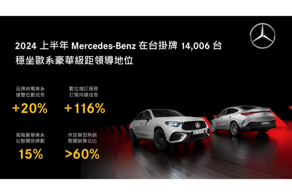 Mercedes-Benz SUV 休旅車系持續為品牌銷售主力,整體 SUV 家族掛牌佔比超過60%,其中以運動跑旅 GLC Coupe 以超過 200% 的成長幅度最為亮眼,而 GLC SUV 運動休旅更有超越 2,000 台的掛牌數,在大型豪華休旅GLE及GLS級距的年增率亦突破60%,而都會休旅 GLA 也有 17% 的成長。