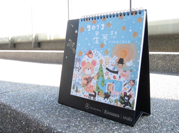 限量發行的2013年桌曆以「夢想」作為主題,由偏遠地區學童彩繪出一幅幅充滿稚趣童心的希望畫作、並首度融入知名藝術家馬里斯(Malis)之「愛、希望、夢想」的插畫創作,帶出孩子們心中的希望飛馬意境。即日起,義賣活動於伊甸基金會網站開跑,每份桌曆愛心認購價為600元,可作為每位學童一週的課後輔導費用;若成為一年以上長期捐款人,捐款累積達7200元以上,更可獲得台灣賓士與知名藝術家馬里斯聯手打造的限量紀念傘一支。本募款專案之義賣所得將全數捐贈給伊甸基金會,作為「象圈工程計畫」的執行基金。