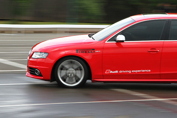 當然,過多的紙上談兵,都比不上實際體驗,因此分組後一開始迎接試車組的,就是quattro科技操控體驗,本關卡乃是在預先灑水的濕滑路面上,透過由錐筒所擺放的一「鉤子型」的路線中,先右轉、立刻左轉的路線內,透過車輛包含ASR、ESP的電子輔助系統全數關閉後,體驗在車身重心瞬間轉移的狀態中,感受quattro驅動力的改變,與對於車身動態所造成的影響;一開始,由Jochi Kleint講師先行示範,先將所駕駛的S4靜止加速至時速約莫60km/h左右後,進入此彎道前放開油門,讓車身重心集中至前輪之際,方向盤握住三點與九點鐘方向立刻往右打180度,此時會感受到車尾重心開始往左擺,同時瞬間再將方向盤往左打360度,便可以成功的將車尾往右甩出,此時車身便會以橫向甩尾的姿態通過此左彎道,最後回正車輛停止,完成。而當筆者自身體驗之際,比照講師的指示,一開始犯了方向盤操作過猛、動作不夠滑順的錯誤,但接下來修正後,發現其實只要以身體仔細感受車身動態,按照講師所教授的要點,此甩尾動作並不難達成,重點示動作要順暢且一氣呵成,無須慌亂的胡亂狂轉方向盤,甩尾就在輕鬆寫意中。