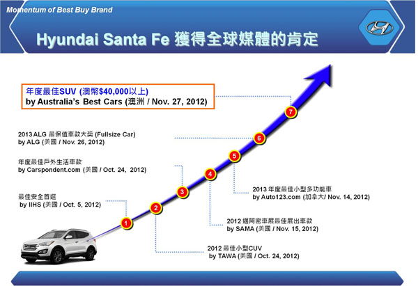 每年由澳洲頂尖的汽車專業人士挑選市場上的暢銷車種,經過極嚴苛試駕後,投票選出澳洲年度最佳車款。測試車款涵括從小型車到豪華車與4WD車款,全都必須通過澳洲最極端的路況測試,並依照操控、安全、價值…等眾多的項目予以評比,因此澳洲年度最佳車款「Australia’s Best Cars」較其他獎項更具公信力。Hyundai以優異的產品品質,旗下的Starex、ALL NEW i30以及Santa Fe紛紛勇奪2012澳洲各級距年度最佳車款。