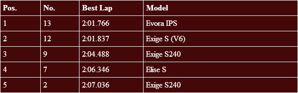 當日Gama Lotus多位車主踴躍參與。其中在正式賽駕駛Lotus Evora IPS的車主,搭配有紋光頭胎,跑出2分01.766秒最快單圈的彪炳成績。值得一提的是,Evora IPS兼顧舒適及性能兩大訴求,配備Lotus IPS手自排變速箱,顛覆了傳統賽車的既有形象在賽道大綻光芒!駕駛New Exige S的車主朋友則全原廠設定,以些微差距達到2分01.837秒,這也是New Exige S在台上市以來在大鵬灣賽車場的首演。而駕駛Exige S 240之車主也奪得2分04.488秒的優異成績。另一位駕駛Exige S 240的車主也在測試賽中以1分59.4秒的成績創新個人記錄。