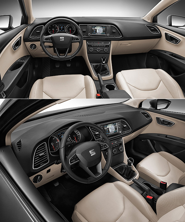 車室內部維持著Volkswagen集團產品貫行的簡約設計,稍向駕駛座傾斜的中控台為使用MQB平臺產品所共有的特色,也讓 Leon ST有著更具動感的車室氛圍。搭配著樸實卻深具實用導向的介面設計以及新一代的滑移式觸控螢幕, Leon ST不僅維持原有的簡約也帶著科技感與動感。同時,增強包覆性的座椅設計,也讓 Leon ST的座艙中瀰漫著與品牌相符的年輕氣息。