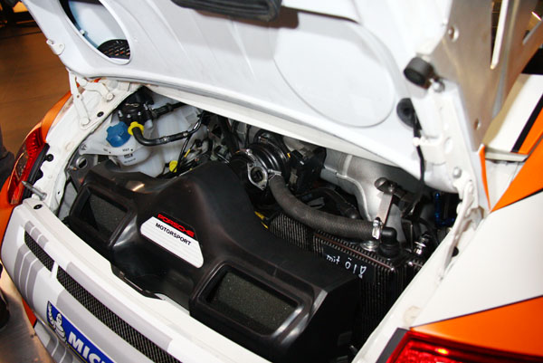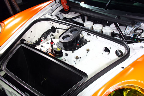 由於引擎搭載於後軸後方,因此車頭原來的行李廂內配有競技專用、對應快速加油槍地防爆油箱。前方的管道並非置物空間,而是水箱散熱管道。