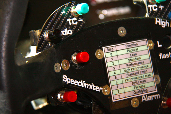 方向盤左側兩顆紅色按鈕中的上方按鈕即為額外電力動能的釋放鈕,可讓車手用於瞬間衝刺與超車之用。