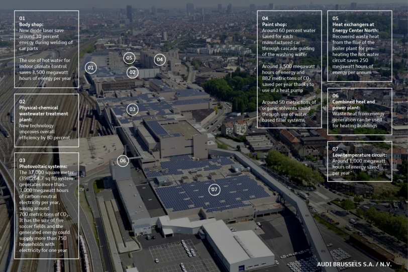 Audi布魯塞爾工廠於今年獲得比利時檢測認證機構Vinçotte頒發碳中和(CO2-neutral)認證。供應廠區包含生產製造在內所需的電力95%來自再生能源,僅5%透過減量額度交易達到碳中和標準,讓Audi布魯塞爾工廠成為全球第一座榮獲碳中和認證的豪華汽車品牌生產工廠。