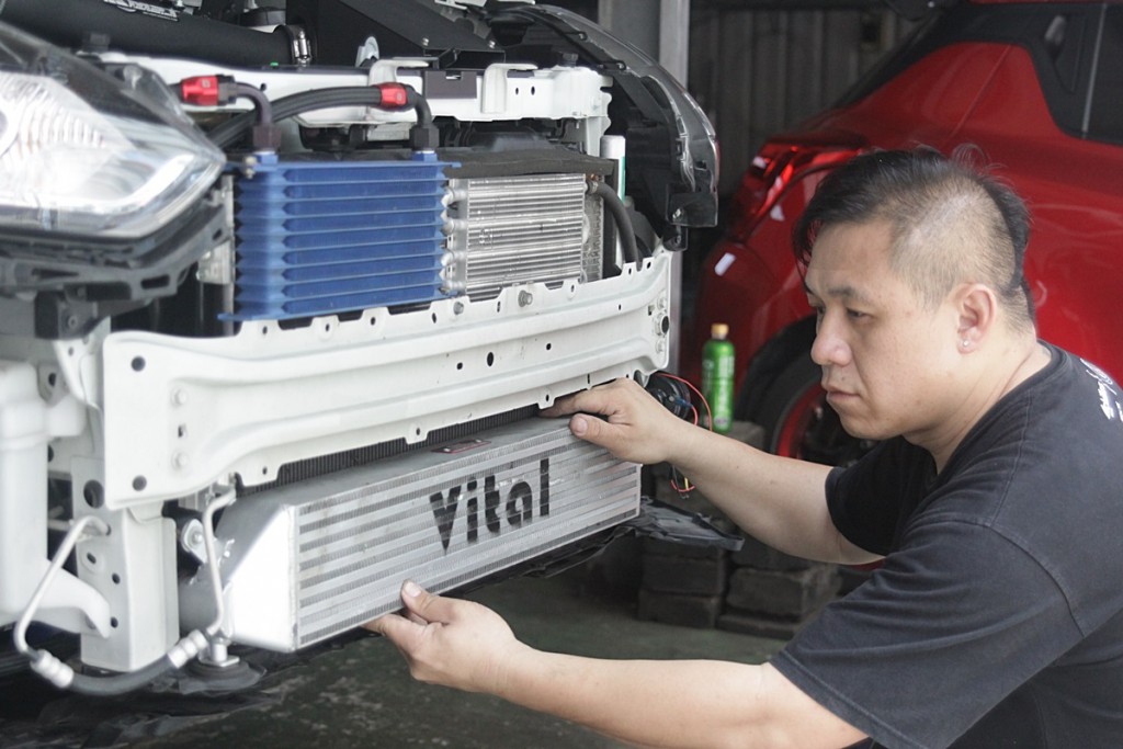 「另外還有專利、在地製造、售後服務,這三點我超級在意,還沒遇見Vital時,那時候採用的中冷是大陸製造的,坦白說品質是連差強人意都過不了,正在傷腦筋時就遇上Vital;我也怕被呼攏的,於是自己去台中Vital不知道參觀了幾十次了,看了設計過程、看了工法、看了製造過程,心裡才有底,之後自己試用Vital,發現對於引擎的溫度降低與保護有一定的提升,尤其是Turbo引擎;再來就是售後服務,用大陸的找誰服務呀! 但是Vital就在臺灣,且無論是漏氣或是管線問題,一通電話馬上處理,這就是我要的態度。」果凍再次用放大鏡檢視汽配零件,把細節裡的魔鬼一一找出,果凍了解安裝效果很重要,但是良率品質態度更是凌駕於效果之上,即便果凍把車主的車改的又快又猛,但是溫度降不下一天到晚看車主把車用拖車拖來也不是滋味,一不作二不休,挑中一個品質穩定售服快的Vital中冷,解決長久以來果凍的棘手問題。