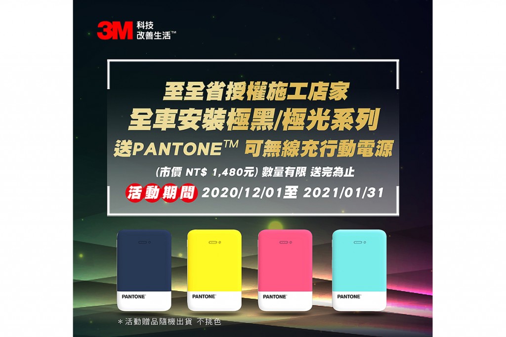 凡於2020年12月1日起至2021年1月31日止,至全台灣3M特約施工通路指定全車(前擋+車身)安裝3M™「極黑奈米陶瓷汽車隔熱紙」或「極光頂級專利多層光學膜汽車隔熱紙」系列隔熱紙,前600名車主即送PANTONE™行動電源(市價1,480),數量有限,送完為止!
