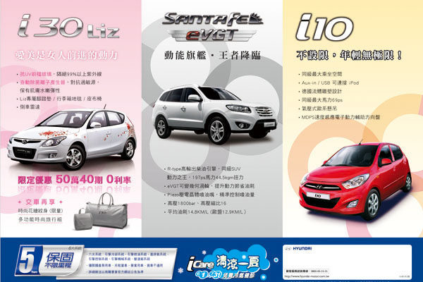 總代理南陽實業表示,提高產品保固是因為對顧客在Hyundai汽車品質上的保證,且為了回饋消費大眾對Hyundai汽車的愛護,也不時推出優惠顧客、體貼顧客的方案。像5月中上市的i30 Liz版,就是專為女性朋友設計的專屬車種。為讓女性朋友不受紫外線侵擾而變成〝黑美人〞,特在原廠便配置了抗UV前擋玻璃,可阻隔紫外線達99%以上,且不會因為須在前擋加貼隔熱紙而形成晚間視線不良的危險冏境。另外在車內還配備了專門對抗過敏源,且具有保持肌膚水嫩彈性的自動除菌負離子產生器。還有專屬的Liz腳踏墊、行李箱地毯、皮布椅以及女性車主最喜歡的倒車雷達。除這些女性專屬配備外,還有限定優惠50萬40期零利率的專案,交車還送多功能時尚旅行組。