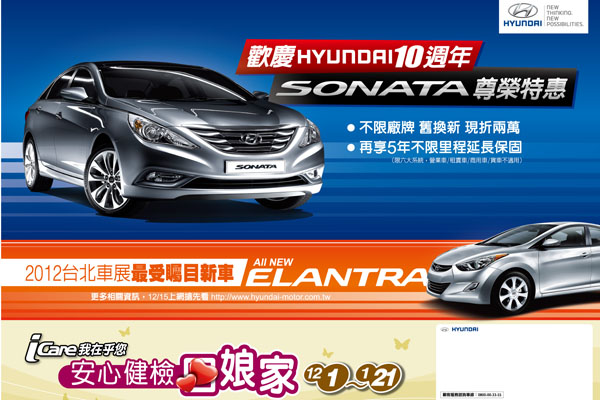 總代理南陽實業在此時,為歡慶與Hyundai品牌合作今年邁入第十年,除原本的延長保固專案之外,在12月領牌交車之乘用車,再享「5年5萬公里免費定期保養」專案,以回饋喜愛Hyundai的消費者。並且來店試乘還可以獲贈精美的2012年Hyundai桌曆,並有機會抽到最流行的iPhone 4S手機。