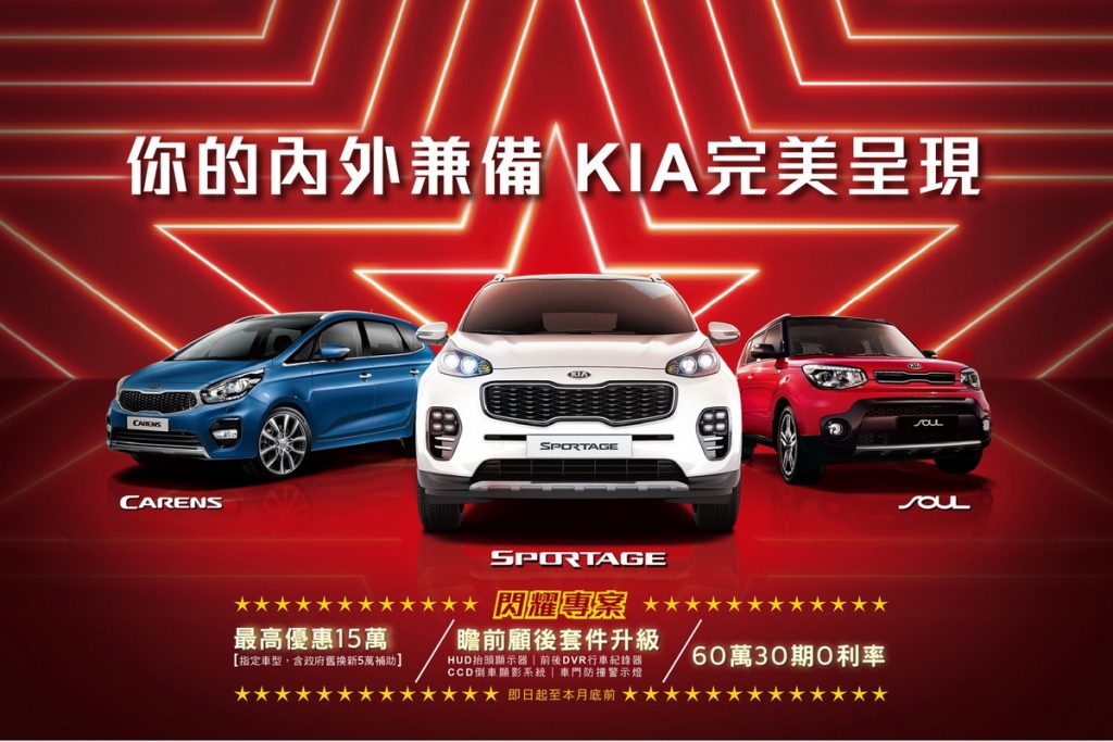 森那美起亞自引進新世代KIA車款,憑藉著囊括世界各大設計大獎的獨特外型,以及不斷精進的造車工藝,贏得許多消費者的信心,近年來,在北美J.D. Power新車品質調查與歐洲多國車輛可靠度調查皆奪下令人驚豔的名次。本月森那美起亞針對SOUL、Carens和All-New Sportage等指定車型指定版本推出「閃耀方案」,免費升級「瞻前顧後套件」,內容包含HUD抬頭顯示器、前後DVR行車紀錄器與CCD倒車顯影系統、車門防撞警示燈等超值配備,本月購車一次擁有,指定版本還享有60萬30期0利率,搭配政府舊換新貨物稅補助政策,All-New Sportage最高可享高達15萬元優惠。