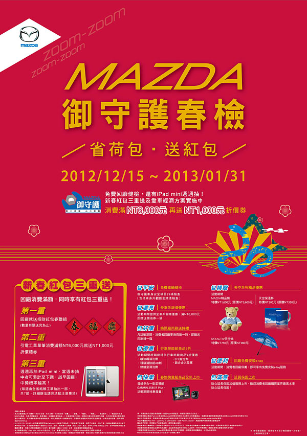 凡於2012年12月15日至2013年1月31日Mazda「御守護春檢」期間內回廠,就能享受御守護29項車身安全項目免費專業健檢,維持愛車最佳狀況,確保年節期間的行車安全,還能參加「紅包三重送」活動,內容包括: