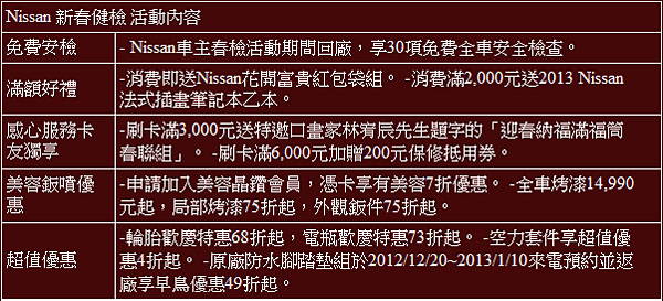 裕隆日產自2012年12月20日起至2013年02月8日止,推出新春健檢活動,提供車主30項免費行車安檢,搭配精美滿額禮、全車烤漆、特惠零件等多項優惠,要讓所有Nissan車主過一個闔家平安的好年。