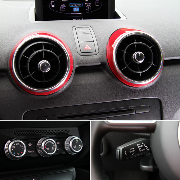 A1 1.4 TFSI也標配了恆溫空調與定速巡航系統,採車身同色飾環的圓型冷氣出風口是A1車內最為亮眼的地方。