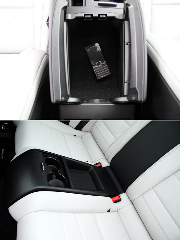 前座中央扶手下的置物空間與後座的置物盒設計。