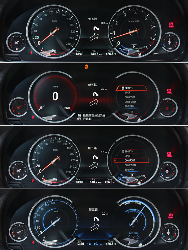 從改款前便已搭載的動態行車模式,經過了此次小改款過程,有著更細分的差異,從最具熱血氛圍的SPORT+開始,一路往下調整,包含SPORT、COMFORT、COMFORT+與不陌生的ECO PRO,於此多樣模式切換時,首先你會發現眼前的10.25吋螢幕中所模擬出的多重行車模式儀表板,會從代表運動化的紅色,一路切換至象徵節能環保的藍色,從視覺就可提醒你箇中不同外,腳下踩的油門反應更是精彩,從ECO PRO那種「興致缺缺」的動力感受,在你還在遲疑這是否有5.7秒實力時,直接切換至SPORT模式,那種與油門深淺幾乎沒有時間差的隨傳隨到,且在不到2000rpm時便可帶動這超過1.8噸的大傢伙往前衝刺;雖然不到澎湃,但那種瞬間湧至的衝刺感,清楚展現此具引擎的活潑性,加上幾乎察覺不到頓挫的換檔反應,與紮實的引擎運轉精緻度,在台灣的用車環境中,740Li就已經很足夠了,且無論你是前後座買家,都是如此。