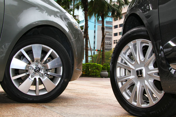 右方為Luxgen7 CEO專屬的七輻式雙爪鋁合金輪圈,左則為Luxgen7 MPV的輪圈款式。