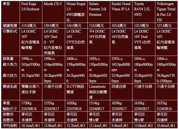 在本次評比的車款中,在動力系統配置上各有不同,也各自反映出各家車廠在動力系統研發上的走向與趨勢,同樣的級距中,排氣量含括了2.0至2.5升,同時也有自然進氣與渦輪增壓動力,動力輸出自150~242hp,中間最大差距達92hp,就連變速系統也同時有傳統自排、CVT無段變速與雙離合器自手排,其中歐系代表Ford Kuga與Volkswagen Tiguan都採渦輪增壓引擎搭配雙離合器變速系統,完全反映了歐洲車廠在動力系統發展上的趨勢,而日系車款則清一色配置自然進氣引擎,在七輛車各自提供了七種截然不同的動力配置與動力輸出下,要在同一平台上較勁,實在不太容易,我們僅能針對各自的表現特色做闡述,再由消費者們決定最後的選擇了。