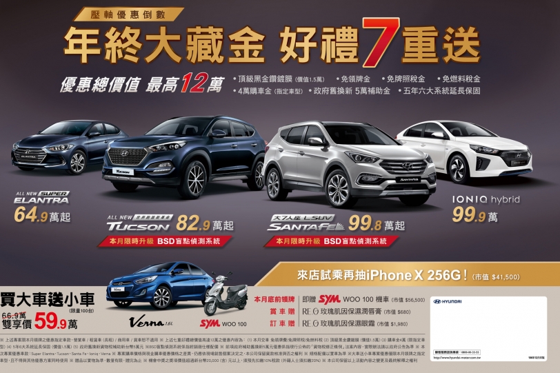 年終買新車優惠時機最後倒數,Hyundai全車系「大藏金」大方送七重好禮,本月底前完成領牌享原廠頂級黑金鑽鍍膜以及稅金三免、高額購車金、政府舊換新貨物稅金、六大系統延長保固等,優惠總價值最高12萬元,機會難得。