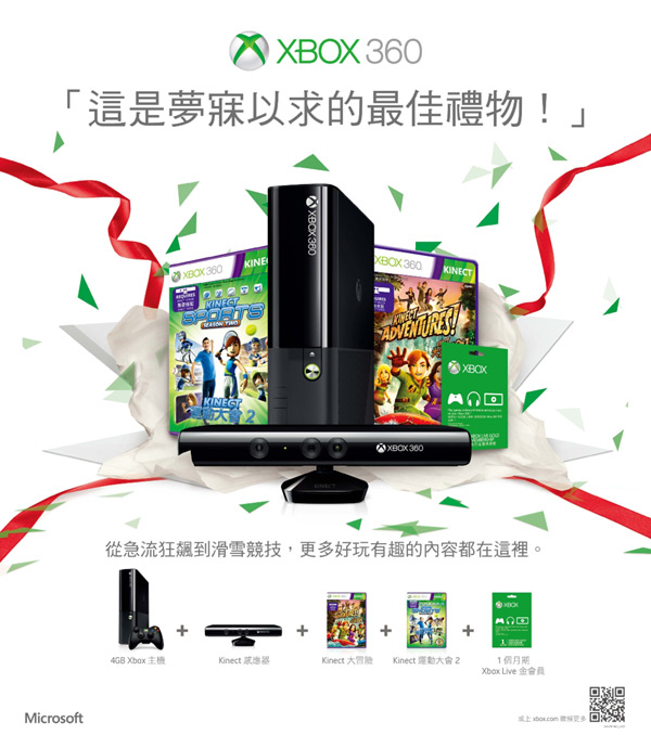 Xbox 360為消費者傳遞佳節歡樂氣氛,帶來最棒的遊戲、最優質的服務、最優惠的價格,無論是還未入手Xbox 360的消費者或想一次收藏經典Xbox 360遊戲的玩家,現在正是最佳入手時機!了解更多 Xbox 資訊請至 Xbox 官網:http://www.xbox.com/zh-TW。