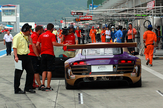 在上午發生事故而引發Safety Car的熊龍,所駕駛的8號賽車在回到車庫後,受損的賽車一度讓人以為難以趕上下午的第二回合比賽。不過,在Audi R8 LMS Cup合作夥伴Absolute Racing的技師努力下,下午開賽前便只剩外觀空力套件的修復,也順利趕上比賽前的Pit Lane開放與繞場圈進入起跑線之中。不過,由於賽道安全官仍未確認賽車是否足以安全進行比賽,技師們仍在起跑線上進行搶修與四輪定位,以求趕上即將開跑的比賽。