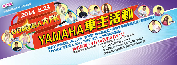 台灣山葉機車為回饋所有支持Yamaha的車主,8月23日特包場「2014台日搞笑藝人大PK」演出,招待全車系車主免費觀賞;只要是Yamaha車主,均可於8月14日至21日期間報名搶先佔位,還可攜伴一名共同參加喔!