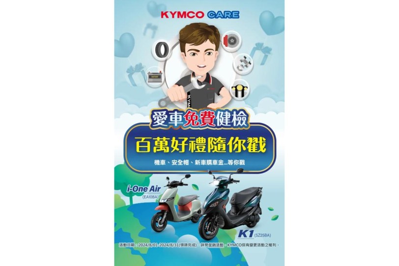 不管燃油機車或電動機車,定期保養愛車不僅能延長車輛壽命,讓愛車更健康還能確保行車安全。即日起至8月31日,全台任一機車品牌車主,只要前往全台指定KYMCO服務門市並且貼有「KYMCO CARE活動海報」之店家,消費滿新台幣200元即可參加手機玩遊戲抽獎乙次。