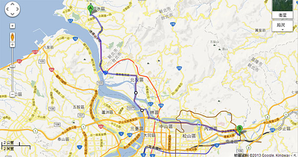 擷取google map路徑規劃圖,此為由淡水新市鎮出發至南港科學園區的汽車行駛路線。