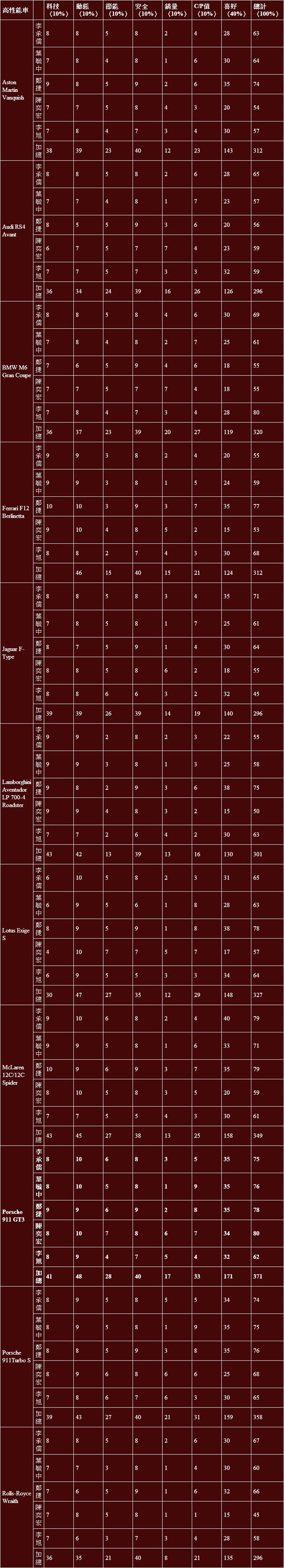 其中分數最低的三輛恰好都落在296分總分,分別是Audi RS4 Avant、Jaguar F-Type以及Rolls-Royce Wraith,基本上到了這等級距,客觀數據已經不是最重要的條件,主觀喜好與車壇定位與地位會是更主導得分高低的關鍵,RS4很遺憾僅管武功高強,但在這群猛獸面前彷彿只能算是頭小羊,F-Type又新又酷,但不夠出色的C/P值與銷售量則是墊底的原因;至於Rolls-Royce Wraith,或許我們年紀還太輕,或許這樣的大GT就該低調沉穩,因此輸給其他既快且炫的酷傢伙,似乎也是理所當然。