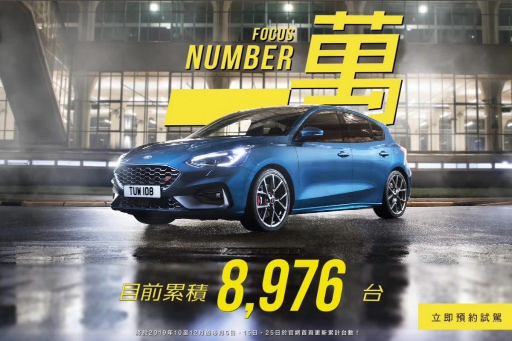 在Focus MK4倒吃甘蔗的好表現助攻下,福特六和今年可以說是國產車的大黑馬,而截至11月累積掛牌數為18,647輛,相比去年大幅成長22.6%,成長率領先群雄。而福特六和為了感謝車迷朋友對於Focus MK4的愛戴,特別推出推出「Focus Number萬」倒數活動,凡於2019年期間在各Ford經銷商完成全新第四代Focus任一車款領牌之車主,即具有參加德國原裝進口Focus ST的抽獎資格,截至目前為止四代Focus在台一共銷售近8,976台,破萬台倒數中。